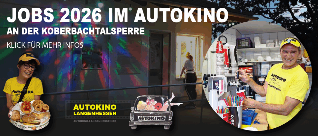 Seit Jahren bringen wir den Autokino-Style an die Kober in Langenhessen. Snacks, Drinks, Burger und vieles mehr servieren wir direkt am Auto. Damit jedes Event zu einem unvergesslichen Erlebnis für unsere Gäste wird, suchen wir dich: